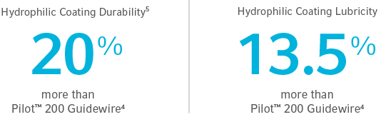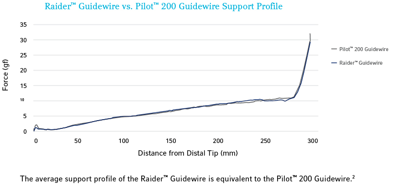 The Raider™ Guidewire features a 10 cm radiopaque tip compared to the Pilot™ 200 Guidewire’s 3 cm radiopaque tip. The Raider™ Guidewire’s extended radiopaque tip length is designed to promote precise positioning under fluoroscopy.